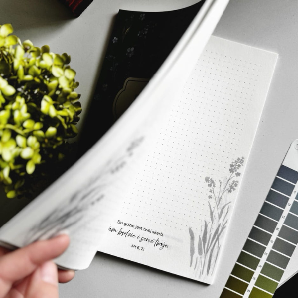 Ten wyjątkowy notatnik z motywem niezapominajek to przestrzeń, w której codzienne myśli, modlitwy i refleksje znajdą swoje miejsce. Delikatny i symboliczny – przypomina o tym, co warto zachować w pamięci.