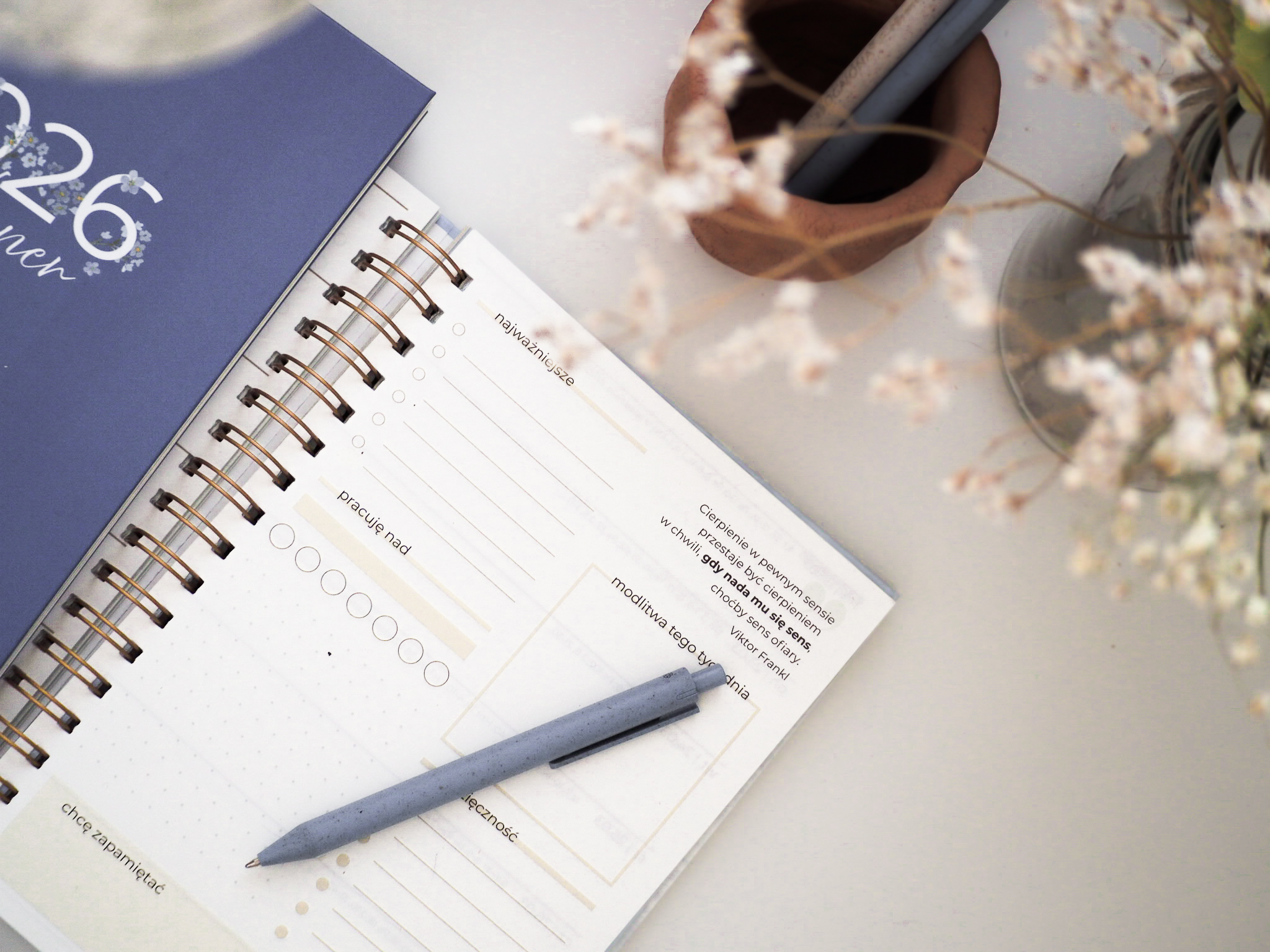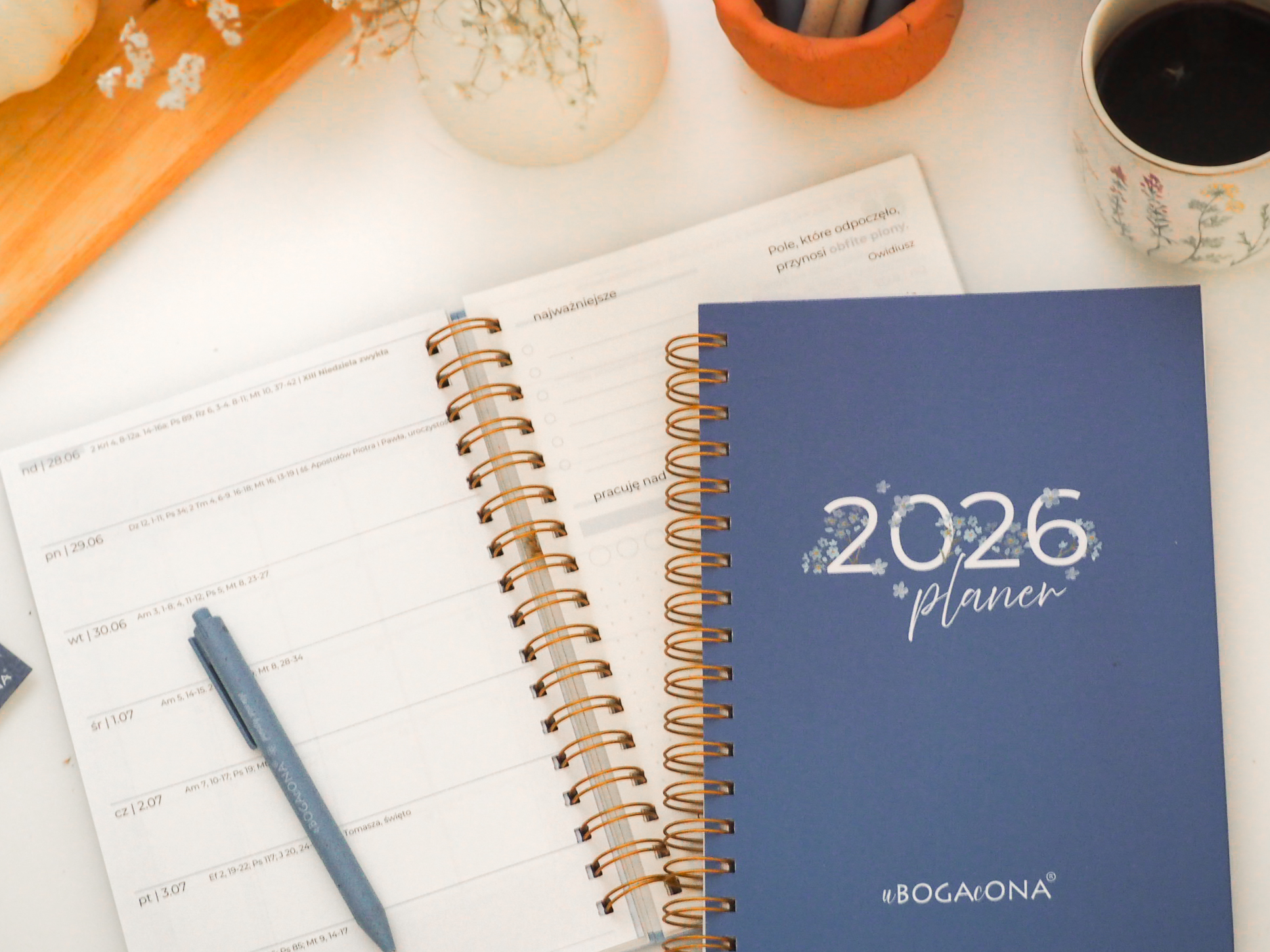 Ten planer to nie tylko estetyczny kalendarz z piękną, akwarelową szatą graficzną. To codzienny towarzysz – przypomina nie tylko o zakupach i spotkaniach, ale też o tym, co naprawdę ważne. Zaprasza do wdzięczności, modlitwy, zatrzymania. Pomaga spojrzeć na życie z Bożej perspektywy.
