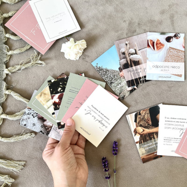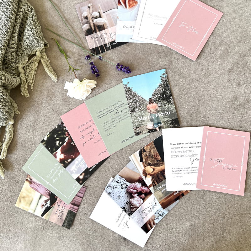 Zestaw 15 karteczek inspirowanych biblijnymi siostrami – Martą i Marią. Możesz położyć je w widocznym miejscu lub zabrać ze sobą w drogę i w ten sposób uBOGAcać swoją codzienność. Opatrzone pięknymi zdjęciami i grafikami podkreślającymi ich przesłanie, będą doskonałym prezentem dla bliskiej kobiety, której obecność chcesz docenić lub dla… samej siebie.